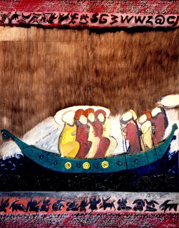 Zoubir Hellal se dit fasciné par l’histoire de l’humanité, qu’il considère comme un réservoir d’images, de récits et de symboles. Il en extrait des séquences courtes, presque des fragments, pour alimenter son imaginaire plastique et sa narration visuelle. Dans Le Départ, d’Al Wassiti, cette fascination prend la forme d’un voyage initiatique. La barque représentée, chargée de personnages auréolés, semble voguer à travers le temps et les civilisations. Le traitement graphique, l’ajout de motifs stylisés et de fausses écritures, ainsi que la tension dramatique de la composition, évoquent un passage : celui d’une société, ou peut-être de l’humanité entière, vers une nouvelle ère. Cette réflexion artistique s’inscrit dans la même veine que le film Stargate, la porte des étoiles de Roland Emmerich, qui explore la connexion entre civilisations anciennes et futur lointain.